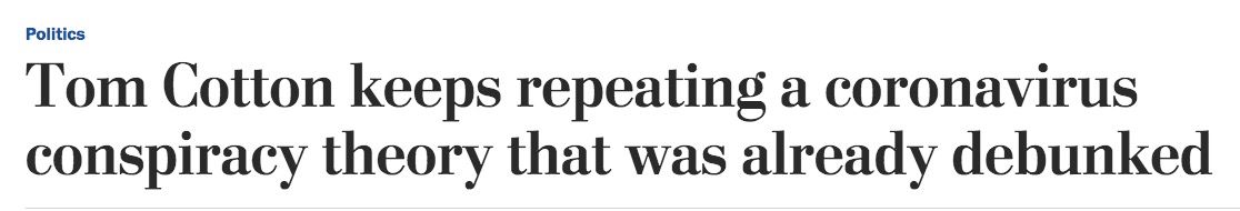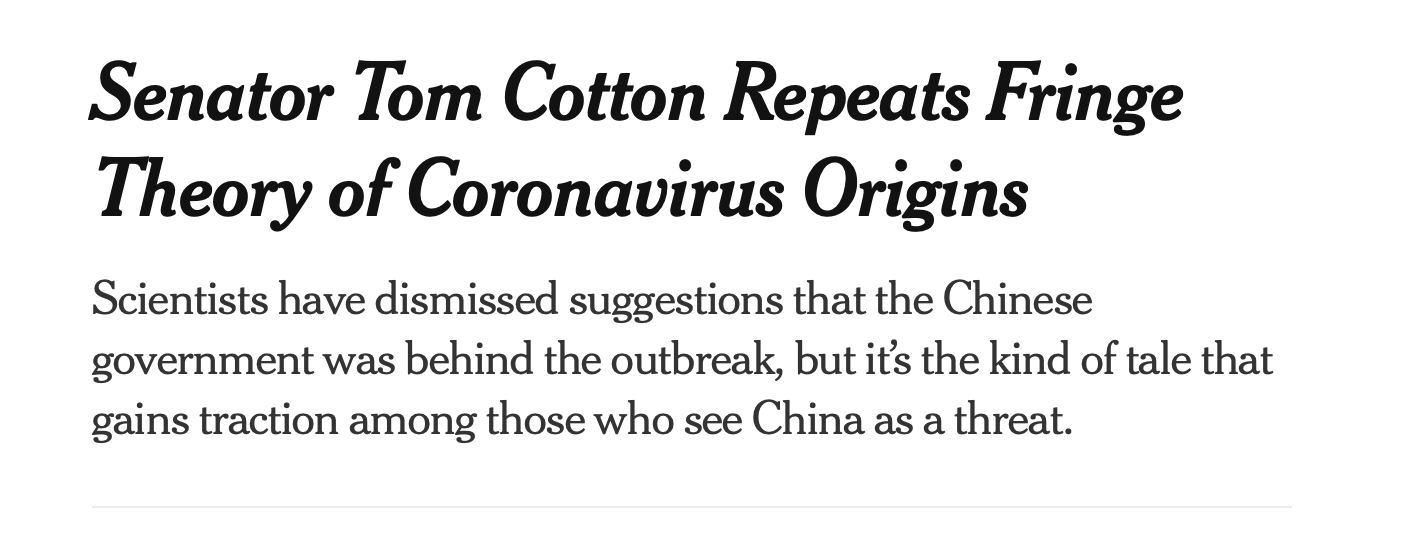 The hypothesis that the COVID virus escaped from a lab, rather than occurring naturally, was considered a fringe conspiracy theory for much of 2020. When US senator Tom Cotton — a vocal Trump supporter — suggested at the start of the year that the theory was plausible, two of the country's most influential media outlets dismissed it as nonsense: