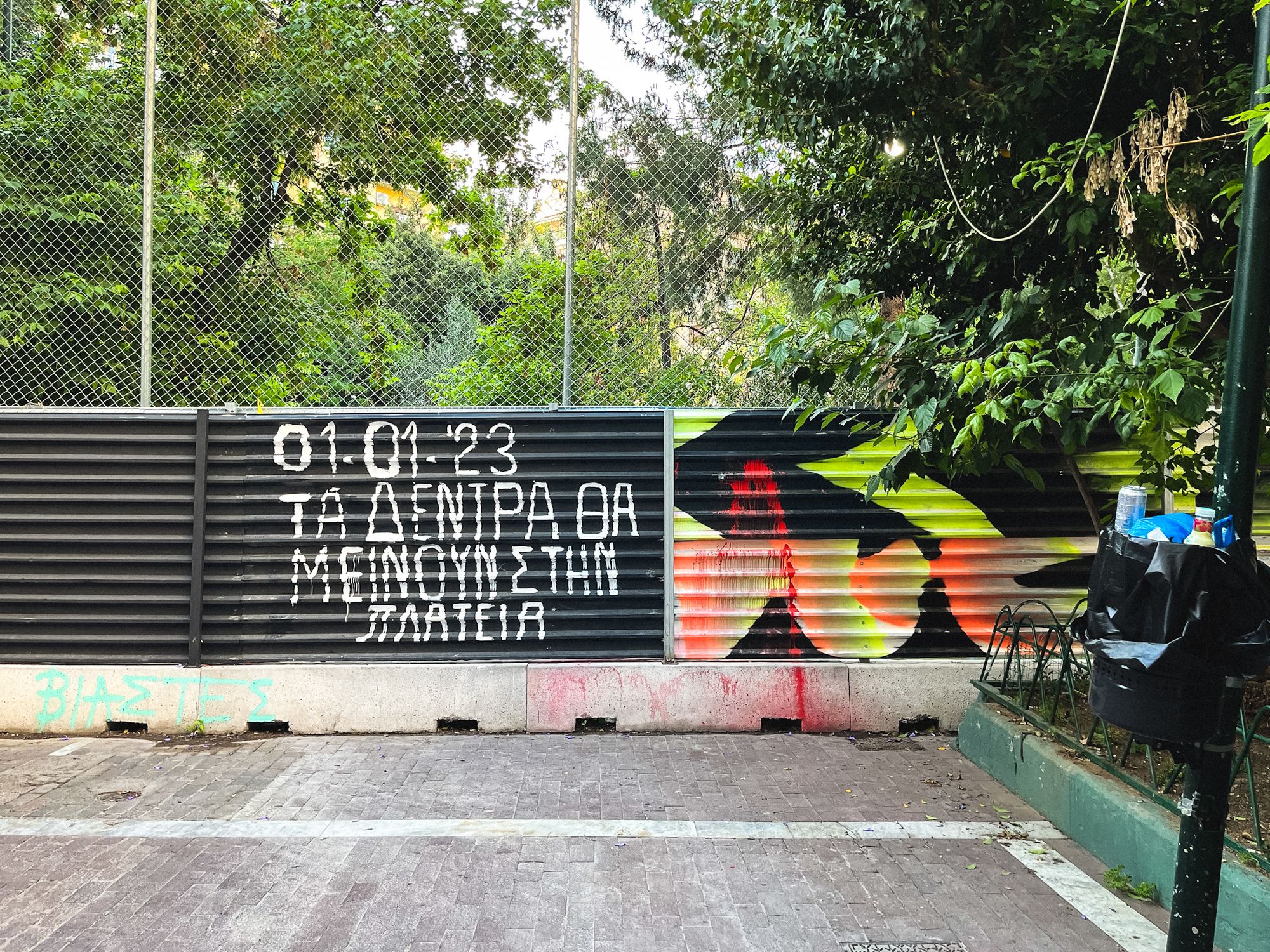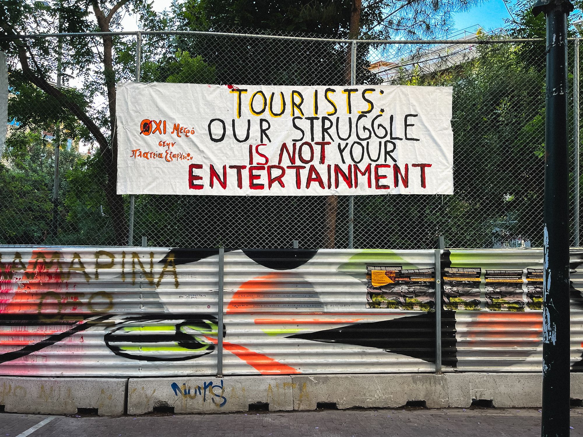 With this shift on my mind I wandered through Exarchia Square, the heart of the historic anarchist district, through the late afternoon shadows. For decades, the police rarely came here. But now, a hundred riot cops guarded a building site, a future metro station, bang in the middle of the plaza where a leafy playground once stood. Spray painted signs on the corrugated walls called meekly for the trees to remain intact, and warned tourists: “Our struggle is not your entertainment”.