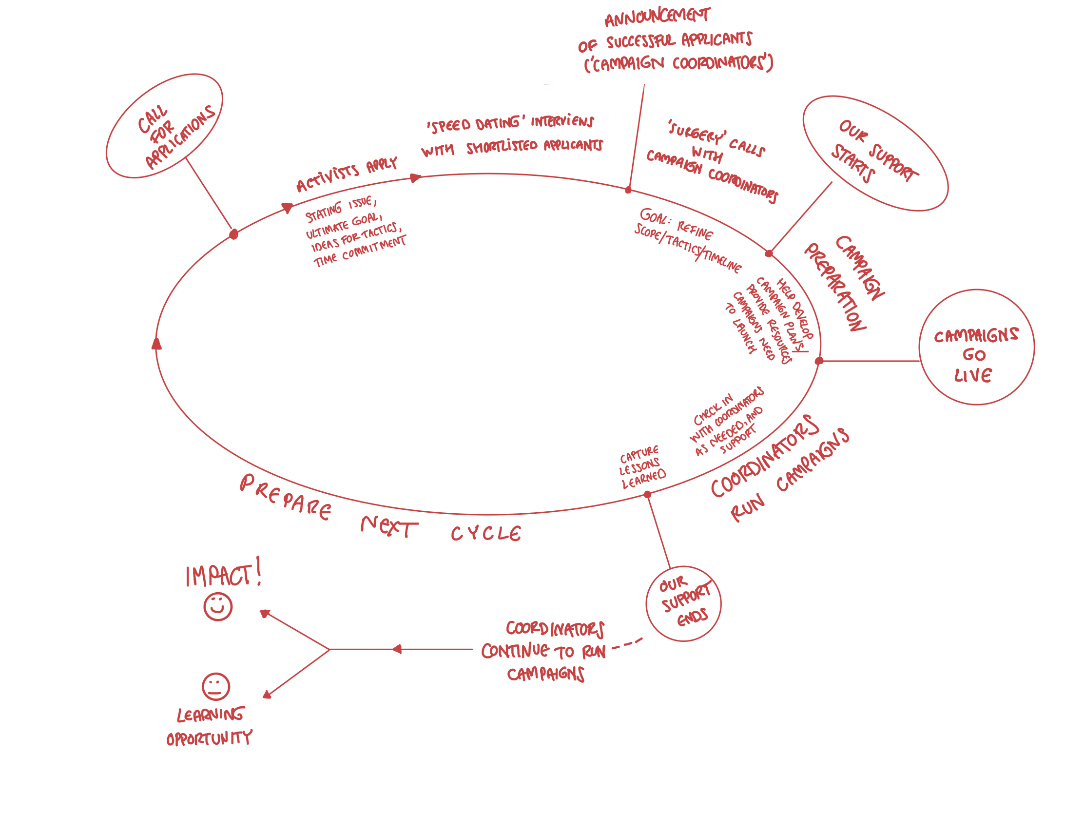 - The coordinators run their campaigns. We take stock of how it went, and integrate what we learn into the next Campaign Accelerator cycle.