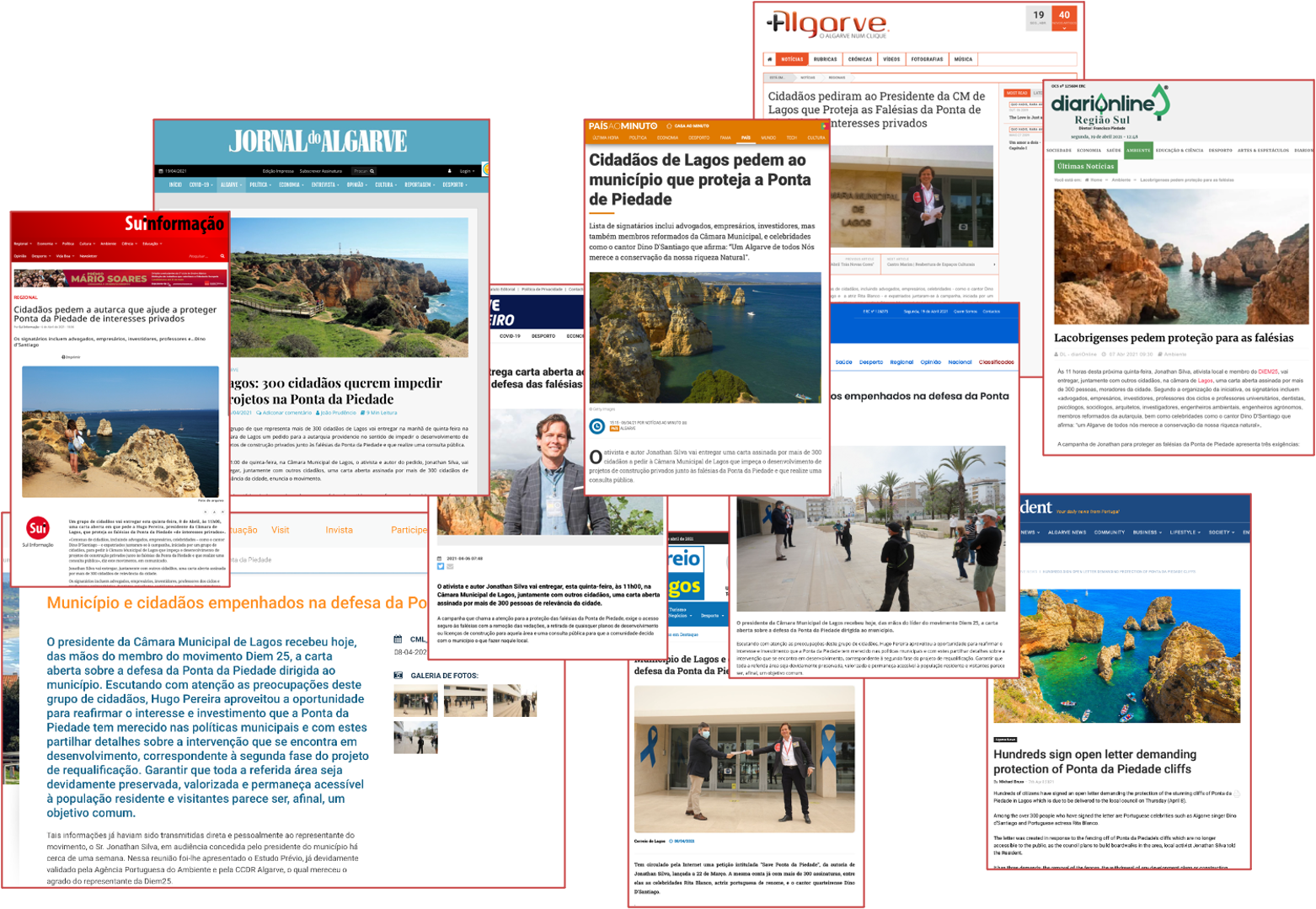 - We generated 20 pieces of positive coverage in regional media, and two in national media. The regional hits were significant, because these outlets were most likely to speak to the mayor’s constituents, and thus this coverage put more pressure on the mayor. Most coverage used the all-important headline of our press release (“Leading citizens of Lagos appeal to mayor to save the Ponta de Piedade cliffs from private interests”), and mentioned DiEM25’s role in the campaign. We were covered in Notícias ao minuto, TSF radio, Sul Informação (x2), Postal, Jornal do Algarve (x2), Algarve Primeiro, Barlavento, Região Sul, Mais Algarve, A Voz do Algarve, Correio de Lagos , CM Lagos , MoveAveiro (French), Algarve Daily News (English) (x2), Expatica (English) and Portugal Resident (English).