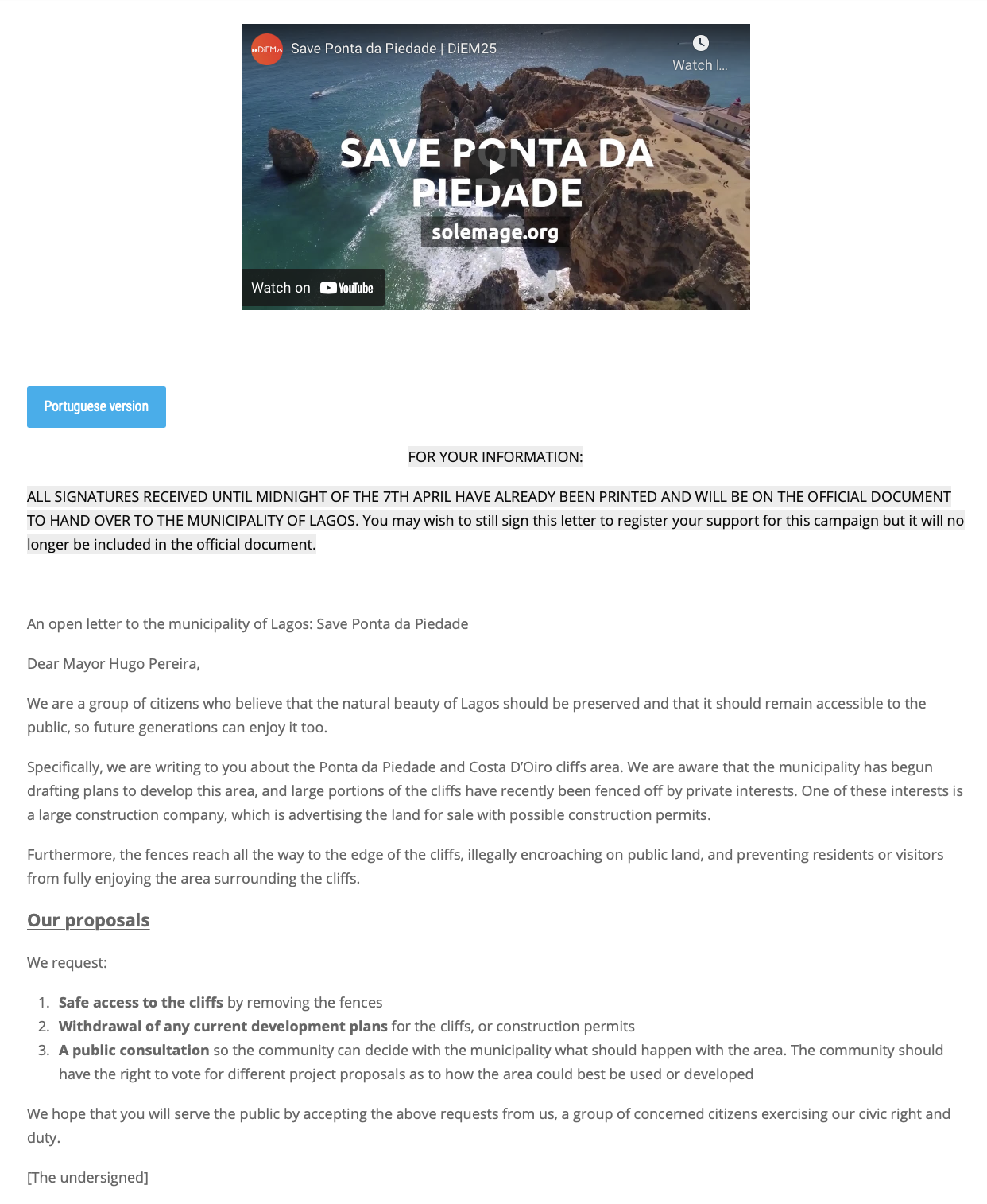 - Our open letter didn’t get high numbers of signatures. With the open letter, our plan was to go for ‘quality’ (i.e. influentials, the ‘leading’ citizens of the headline we were aiming for). But quantity would have helped too, and 500+ signatures was nothing to shout about. We called out for signatures from DiEM25’s network, but didn’t get the numbers. Perhaps this was because DiEM25 is a pan-European movement, and local, grassroots activism like the Ponta Da Piedade story isn’t what people (yet) associate with it. Furthermore, the movement doesn’t have much presence in Portugal.